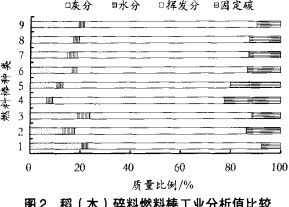 标,四个指标测试值满足如下数学关系:水分含量(%)+灰分含量(%)+挥发分含量(%)+固定碳含量(%)= 100%。本试验对不同原料的燃料棒进行分析,结果见表l和图2。结果表明,所有燃料棒产品(1~9号试件)的挥发分含量相近( 64.62%~69.27%),但灰分含量( 6.62%~20.85%)和固定碳含量(7.54%~22.37%)随粉屑形态和原料配比的变化,呈现显著差异。1)粉屑形态的影响:以1—2号试件为代表,尽管同为稻草,碎料的灰分含量(20.85%)明显比砂光粉( 13.41010)高。这可从稻草板的制造工艺过程分析:稻草一截断(含分选)→粉碎→分选-→稻草碎料→稻草板→砂光→砂光粉。由此可见,从稻草到砂光粉,经历了两次分选工序,导致无机矿物质(灰分)含量有所降低。2)原料配比的影响:随着稻草碎料混合比例的提高(20%→80%),混合燃料棒的灰分合量明显增加(“稻草碎料一木粉”:6.62%→16.72%;“稻草碎料→稻粉”:14.90%→19.36%)。