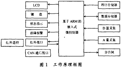 嵌入式综合保护器主要由ARM主控制模块、交流采样模块、CAN通信模块和1/0模块以及人机接口等组成,工作原理框图如图1所示。